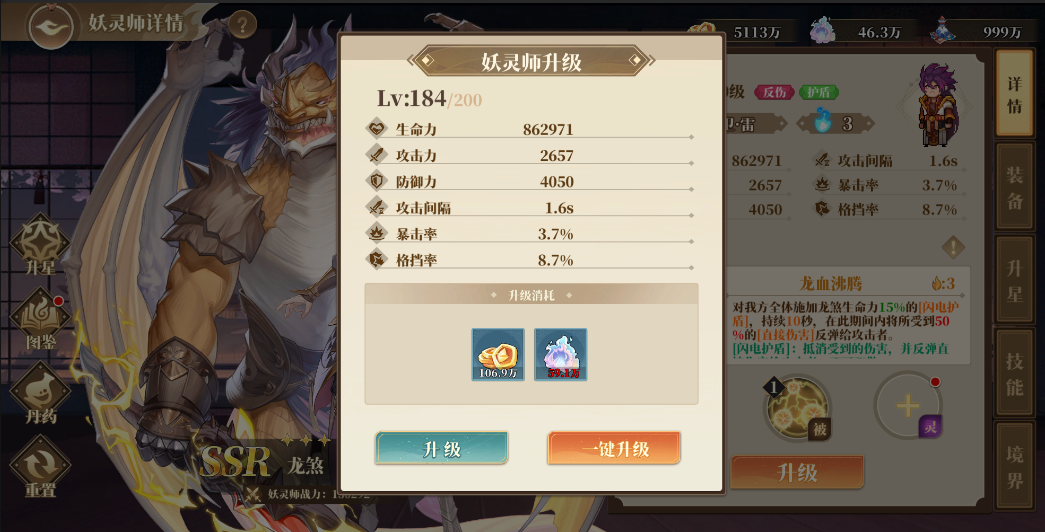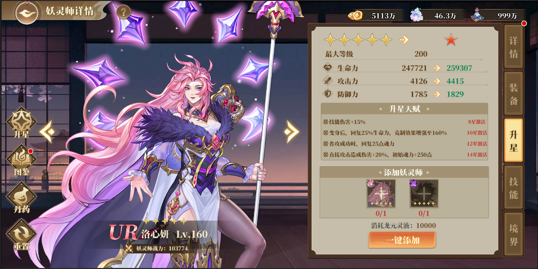 妖靈師可以通過(guò)消耗升級材料(妖晶幣、龍元靈液)提升等級,而升級可以提升面板屬性,當達到等級上限時(shí)可以通過(guò)消耗妖晶幣、龍元靈液和九轉丹進(jìn)階等級上限。不過(guò)前期資源有限,還是盡量避免將養成材料分散給太多角色,練好一隊主力隊伍能過(guò)主線(xiàn)才是最重要的。?