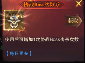 BOSS疲勞:可以通過(guò)消耗協(xié)戰BOSS次數券來(lái)恢復疲勞。當前只能通過(guò)每日累充來(lái)獲取。獲取途徑比較有限,但建議每天都拿到。