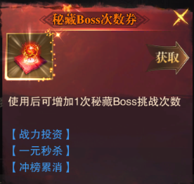 秘藏BOSS次數券來(lái)增加挑戰的次數。秘藏BOSS券獲得的途徑比較多,主要有: