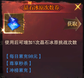 挑戰機會(huì ):成為SVIP后可以通過(guò)花費20泰坦幣來(lái)購買(mǎi)多1次挑戰機會(huì )。也可以使用晶石冰原次數券來(lái)增加挑戰次數。晶石冰原次數券獲得的途徑比較多,